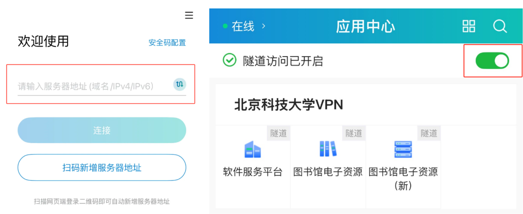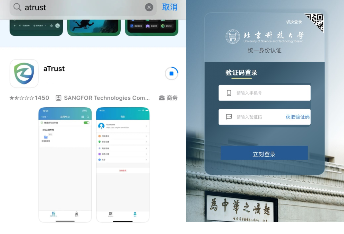 打开手机软件商店搜索“aTrust"下载并安装客户端,安装完成后,需先登录统一身份认证。首次使用客户端需要手动填入服务器地址:https://vpn1.ustb.edu.cn,配置完成后会直接跳转入校内界面,打开右上角的VPN开关即可开始使用。