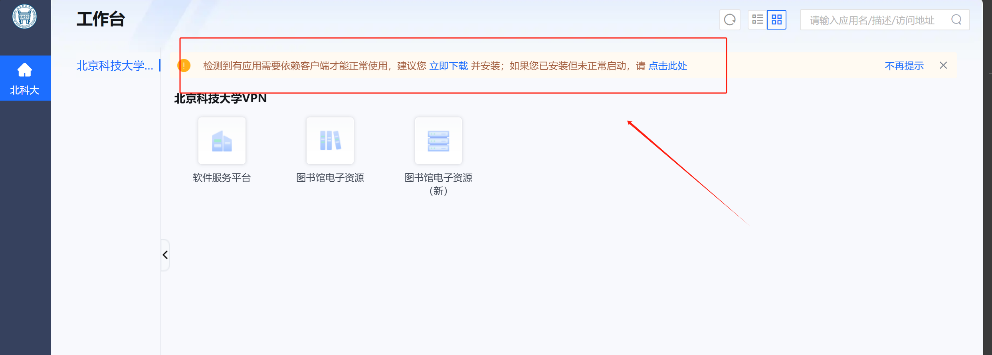 浏览器访问北京科技大学VPN网址:https://vpn1.ustb.edu.cn,并扫码登录统一身份认证。登录成功后,工作台提示栏点击 “立即下载”下载客户端。